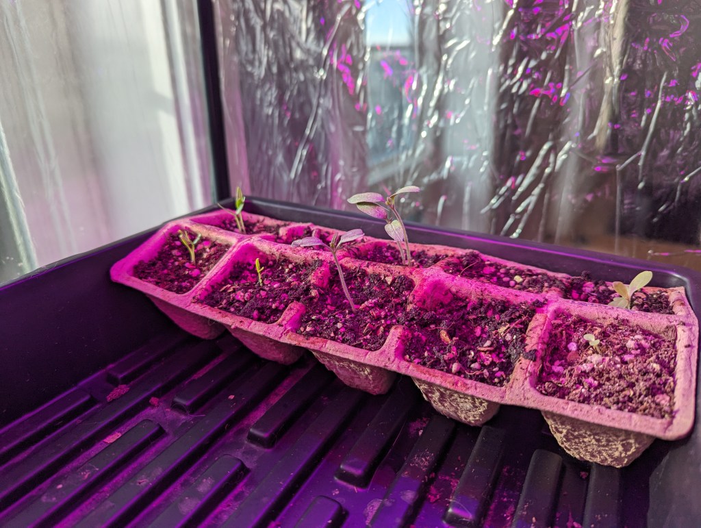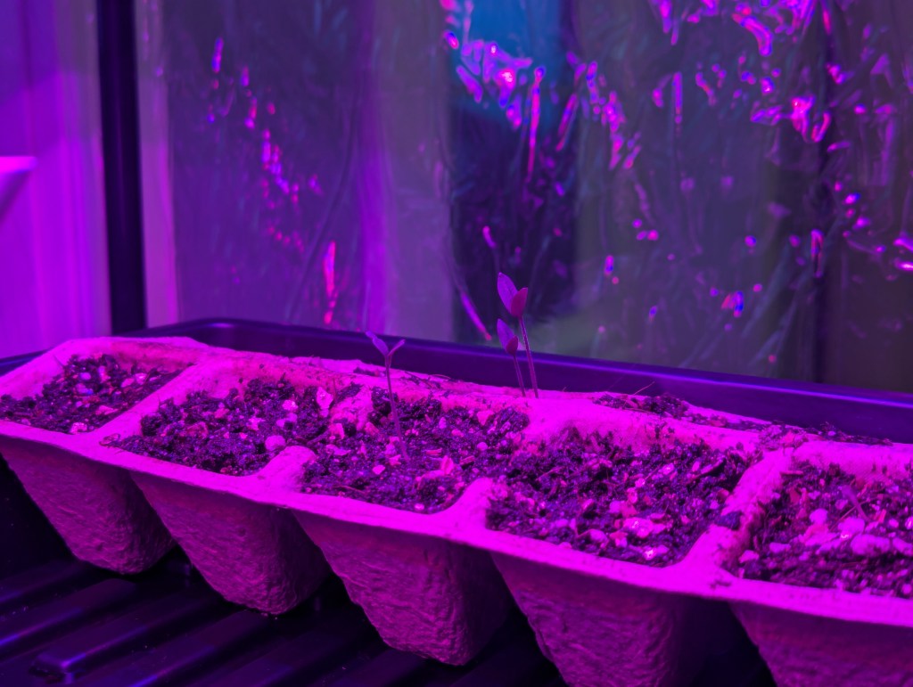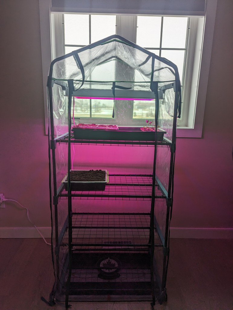 March 10th– I built the little indoor greenhouse, set up the grow light, and placed my little seedlings from the seed starting workshop inside. I also set a timer for the grow light, following the recommendation of 16 hours on and 8 hours off. My grow light uses red and blue lights, and to promote germination, I currently have it set to the red light.